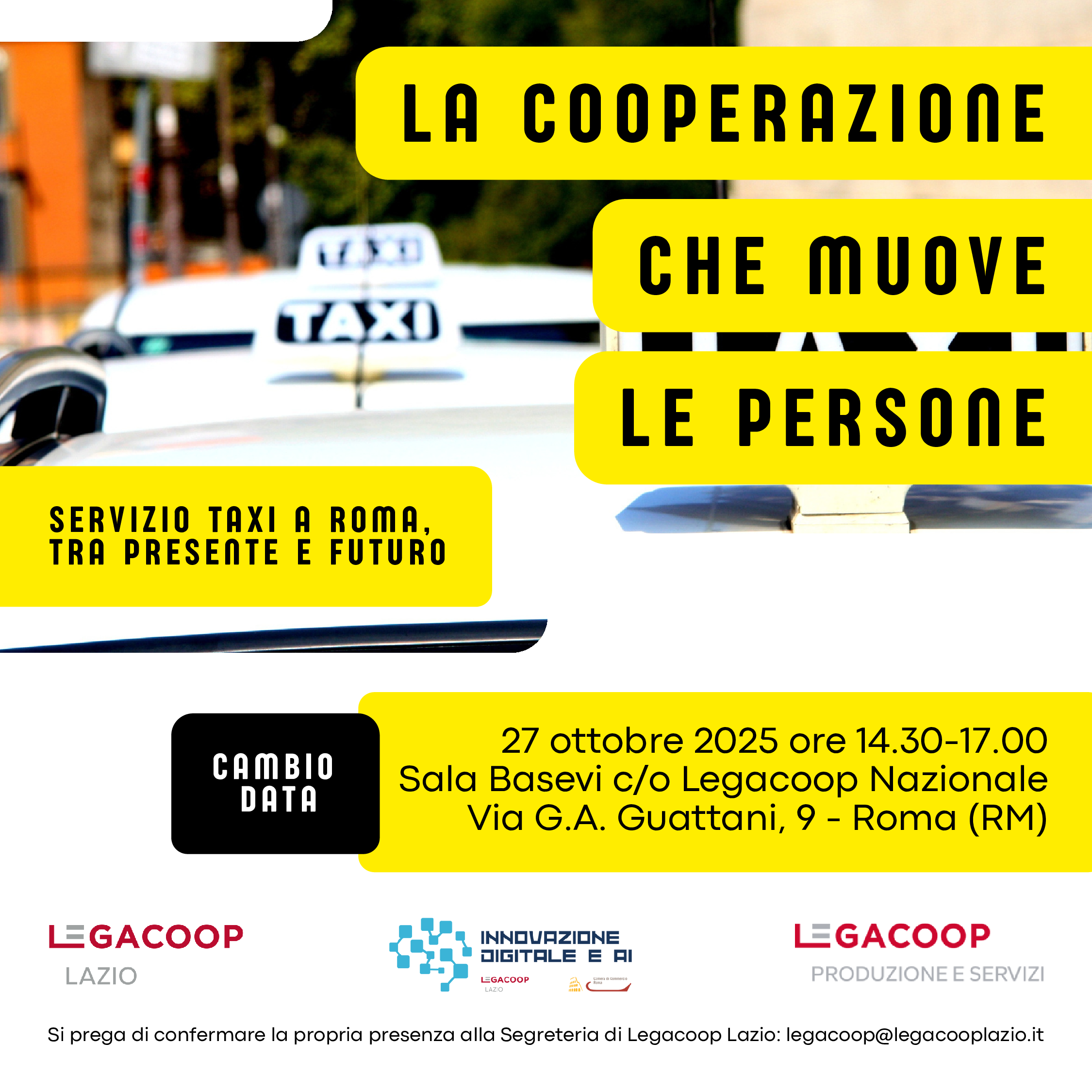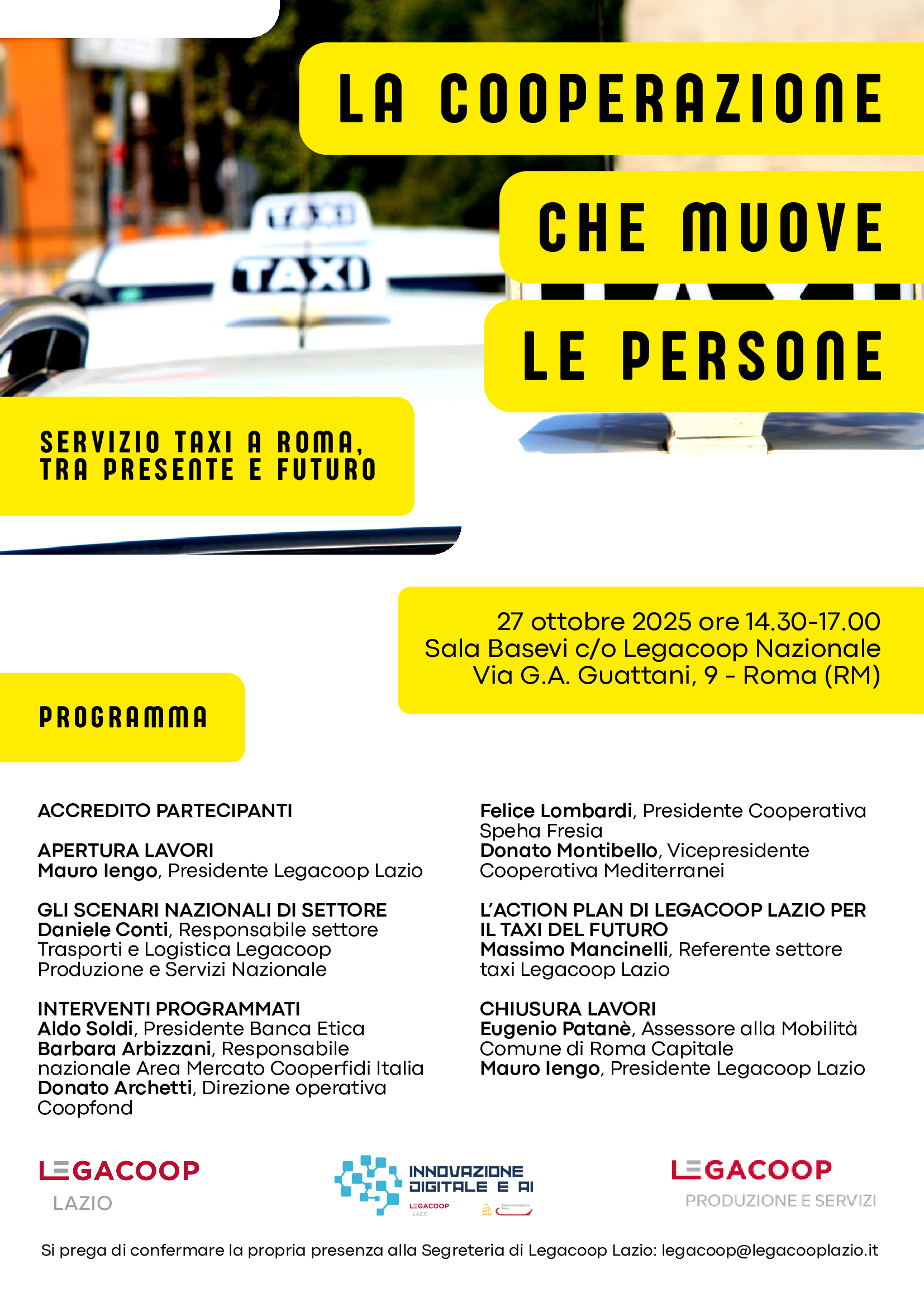 Il servizio taxi a Roma tra presente e futuro: è questo l’oggetto dell’evento dal titolo “La cooperazione che muove le persone” che Legacoop Lazio, insieme a Legacoop Produzione e Servizi, organizza in data 27 ottobre alle ore 14.30 presso la Sala Basevi in Via Guattani 9 a Roma.