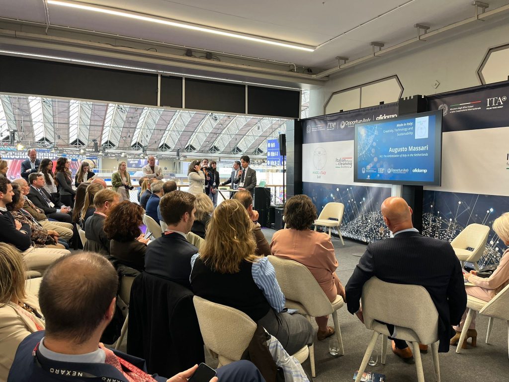 L’Associazione ha inoltre partecipato, rappresentata dal Responsabile del Multiservizi Olmo Gazzarri, al Made in Italy Day, alla presenza dell’Ambasciatore italiano Augusto Massari, che ha sottolineato l’importanza delle relazioni tra Italia e Paesi Bassi e l’impegno del proprio Ufficio nel favorire l’integrazione delle attività, dei servizi e dei prodotti delle imprese italiane nell’economia olandese. Massari ha inoltre evidenziato come la ricerca di una sempre maggiore competitività, fondata sull’innovazione, rappresenti oggi un fattore chiave di sviluppo, sottolineando al contempo il valore della partecipazione alla Fiera di tanti rappresentanti d’imprese di tutta la filiera.