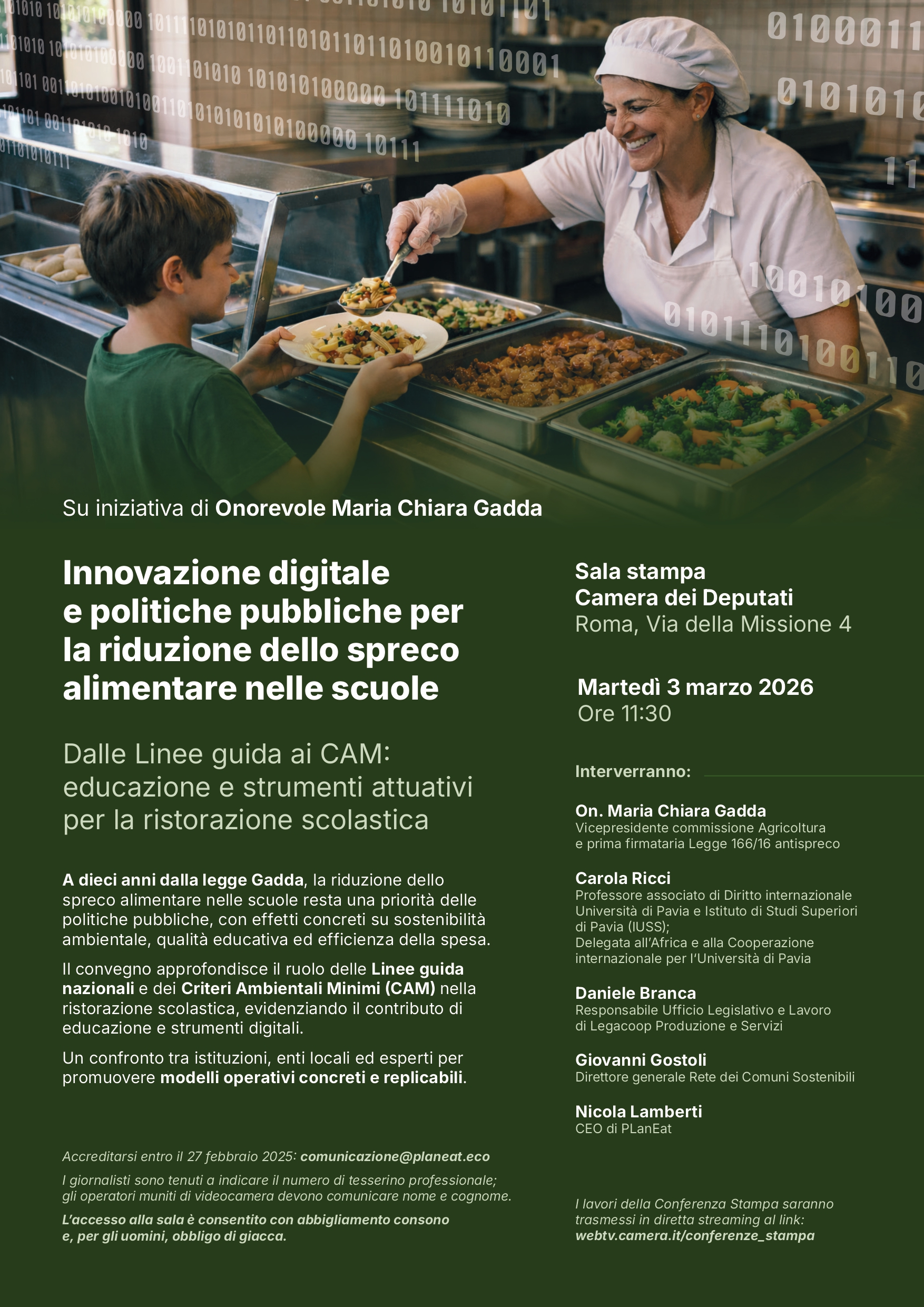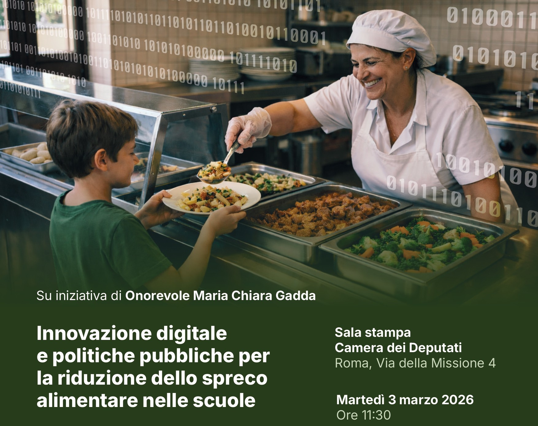 Martedì 3 marzo 2026, alle ore 11:30, la Sala Stampa della Camera dei Deputati ospiterà il convegno “Innovazione digitale e politiche pubbliche per la riduzione dello spreco alimentare nelle scuole”, promosso su iniziativa dell’On. Maria Chiara Gadda, Vicepresidente della Commissione Agricoltura e prima firmataria della Legge 166/2016.